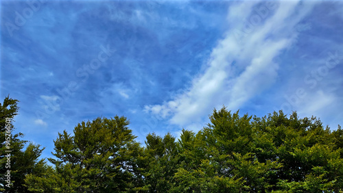 © astrosystem, Fototapeta premium Green trees with summertime blue skies and clouds.
