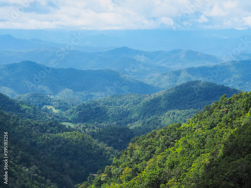 © pkanchana, Fototapeta premium Green treetops on the mountain against blue sky.