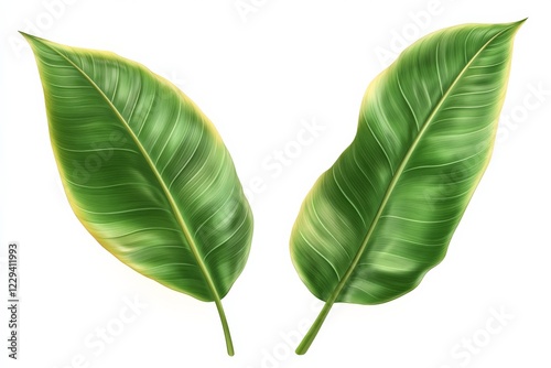 © ChaoticMind, Obraz premium Green tropical leaves showcasing glossy texture and intricate vein patterns in a bright lighting environment
