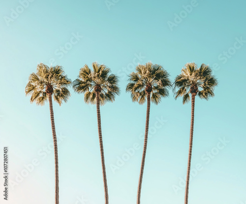 Obraz premium Green tropical palm trees row against blue sunny sky nature background
