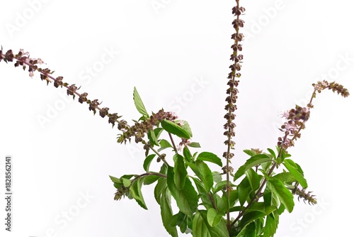 © Daney, Naklejka premium green Tulsi, holy basil plant leaves with flowers isolated on white background