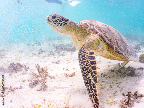 Obraz premium アマモを食べている。 アオウミガメ, Green Turtle, Green Sea Turtle, Chelonia mydas, ウミガメ科, 阿嘉島前浜ビーチ 沖縄県島尻郡慶良間諸島-2025 沖縄本島から40km西方にある諸島。 大小30以上の島々からなる島嶼群は全体が国立公園に指定されている。 珊瑚礁の海、白い砂浜、緑の山地は世界屈指の美しさ。 多くの貴重な動植物が生息している。
