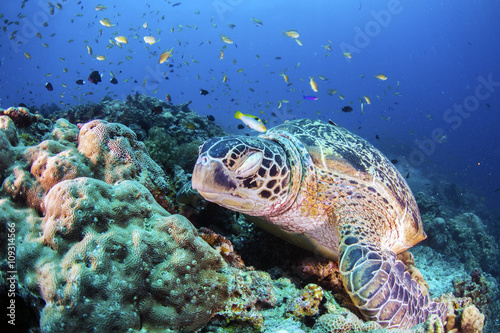 Obraz premium Green Turtle on the sea bed amongst the coral.