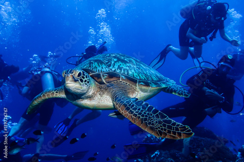 Fototapeta premium Green Turtle swimming with divers