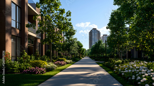 © PYP STOCK, Fototapeta premium Green Urban Landscape with Trees Lining Street and Modern Buildings Under Blue Sky