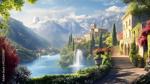 © Depal, Fototapeta premium Green valley surrounded by hills and flowing river high resolution picture