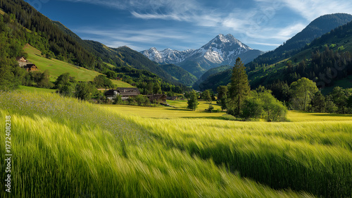 © SHALENA, Fototapeta premium Green valley with a farmhouse and snowcapped mountain in the background