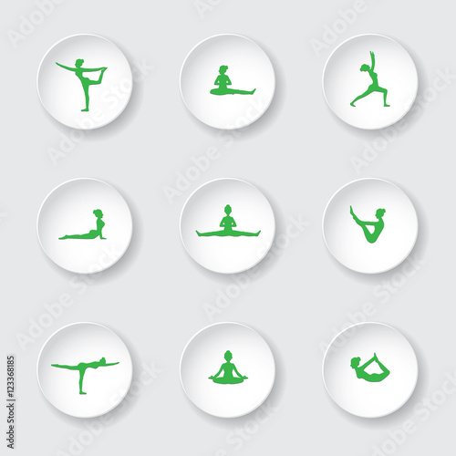 Obraz premium 9 green vector yoga pose silhouettes on white button