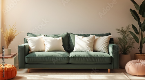 Naklejka premium green velvet sofa with pillows in a sunlit living room