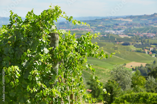 Fototapeta premium Green vine twigs and hills background in a sunny day in Italy