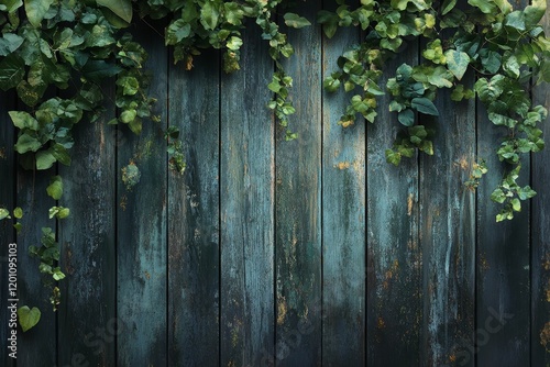 © Murda, Fototapeta premium Green vines drape down blue-painted wood planks.