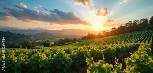 © miss irine, Fototapeta premium Green vineyard rows at sunset. Scenic vineyard landscape with mountains. Beautiful summer vine plantation view. Wine making farm agriculture concept. Natural wine region with horizon line. Rural