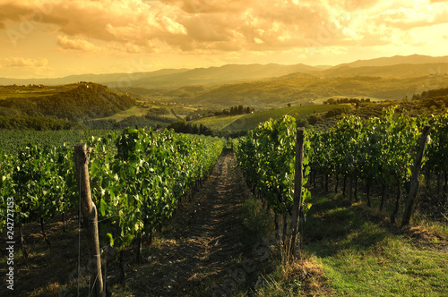 Naklejka premium Green vineyards at sunset in Chianti region, Tuscany. Italy