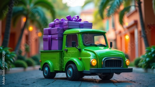 © MdAzizulHaque, Obraz premium Green vintage truck carrying large purple gifts; whimsical, festive, delivery concept.
