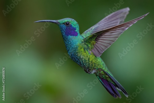 © Iftikhar alam, Obraz premium Green Violetear hummingbird hovering elegantly in a lush setting with vibrant plumage and iridescent colors