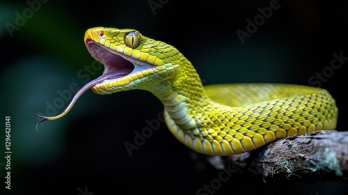 © Dece Std, Obraz premium Green viper striking, jungle branch, night, wildlife