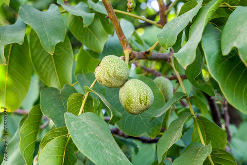 Obraz premium green walnuts. The nuts are hanging on a tree branch.