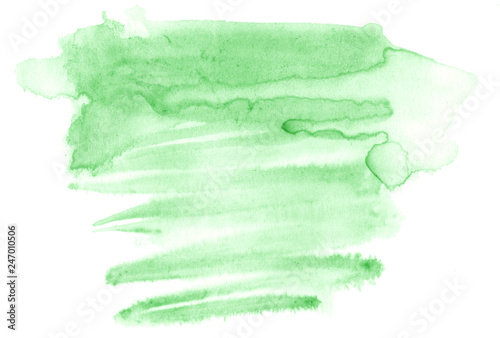 © ss404045, Fototapeta premium Green watercolor hand-drawn isolated wash stain on white background for text, design. Abstract texture made by brush for wallpaper, label.