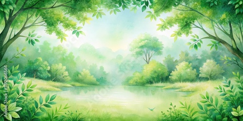 Fototapeta premium Green watercolor landscape with lush foliage and a serene atmosphere,...