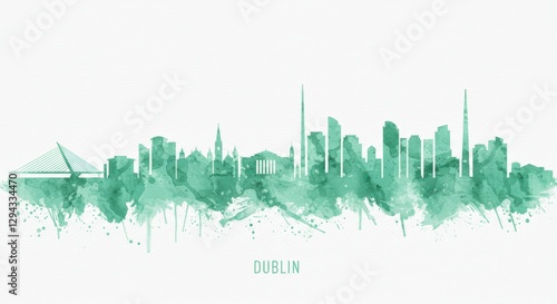 Fototapeta premium Green watercolor skyline of dublin with iconic landmarks and modern cityscape silhouette