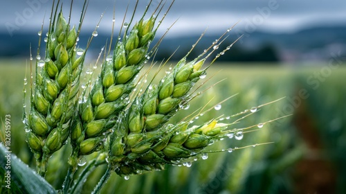 © Lubos Chlubny, Naklejka premium Green wheat ears covered in fresh rain drops