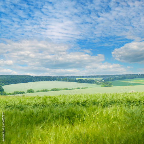© alinamd, Obraz premium Green wheat field and blue sky.