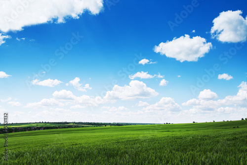 © Gerisima, Obraz premium Green wheat field and cloudy sky, agriculture scene.