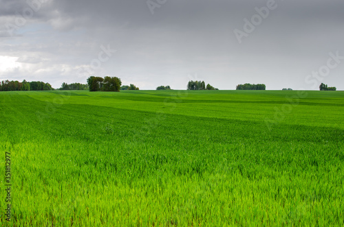 Fototapeta premium Green wheat field in spring before the rain. Natural irrigation of fields by...