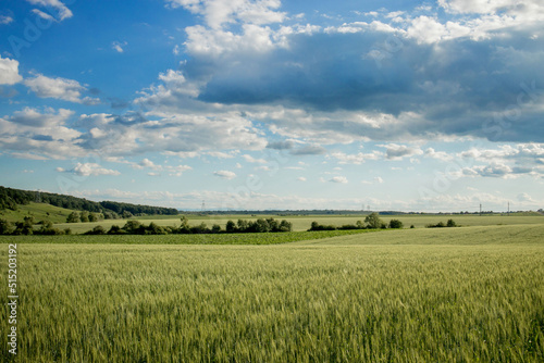 © volody10, Obraz premium Green wheat fields on a background of blue sky. Landscape with a field of spikelets