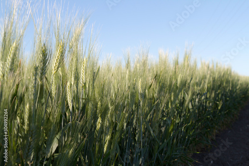 Obraz premium green wheat spikes growing in the border countryside. Selective focus