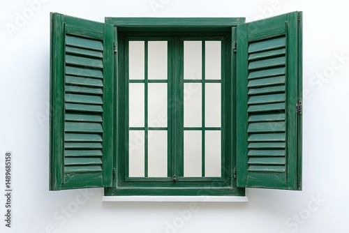 © Sunny, Fototapeta premium Green Window Shutters Open on a White Wall on white background