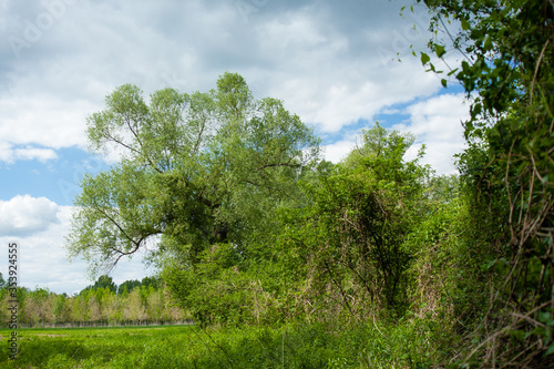 Fototapeta premium Green wood and blue and white sky