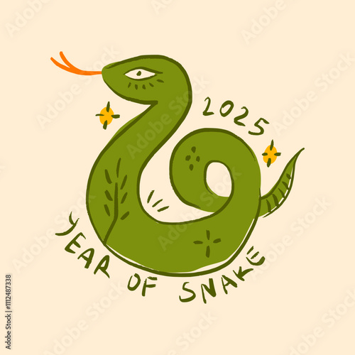 Fototapeta premium Green Wooden Snake Lunar Chinese New Year 2025 Holiday Funky Groovy Postcard Illustration Cartoon Humor Boho Childish Drawing. Vector Christmas Animal Kids Stylized Concept With Lettering Clip-art
