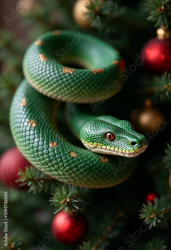 © Юлія Мельник, Fototapeta premium green wooden snake on a Christmas tree