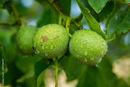 Obraz premium Green young walnuts grow on a tree after the rain. The walnut tree grows...