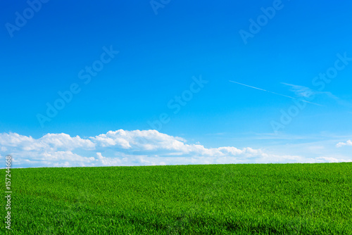 © nevodka.com, Fototapeta premium Green young wheat field at sunny spring day with blue sky