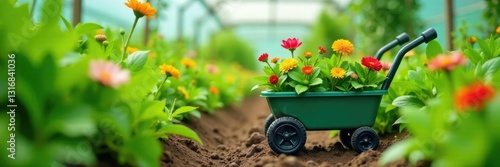 © Sutasinee, Fototapeta premium Greenery and flowers in a plastic garden cart, vegetation, greenhouse