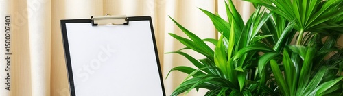 Obraz premium Greenery and light beige curtains envelop an empty clipboard