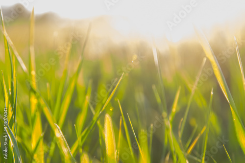© Юлия Заиченко, Fototapeta premium Greenery. Grass close-up. The plant is large. Wallpaper. Sun glare light.