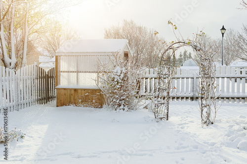 Obraz premium Greenhouse and arbor covered in snow in an urban back yard.