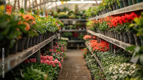 Fototapeta premium Greenhouse and Nursery: Specializes in growing and selling plants, flowers, shrubs, and gardening supplies, offering expert landscaping advice and services.