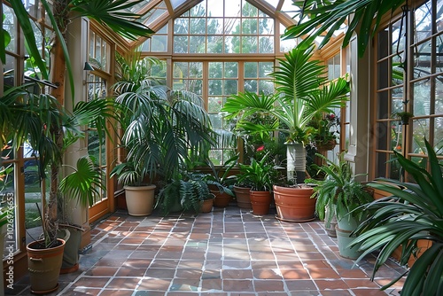 Fototapeta premium Greenhouse in a garden with plants and trees