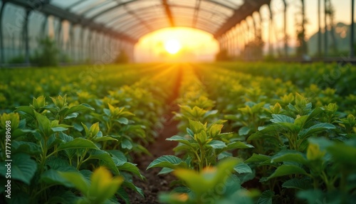 © Maryna, Naklejka premium Greenhouse with crops bathed in sunlight eco challenges. Farming under artificial sun raises questions on food production. Concept illustrates impact of climate change on agriculture, resources.