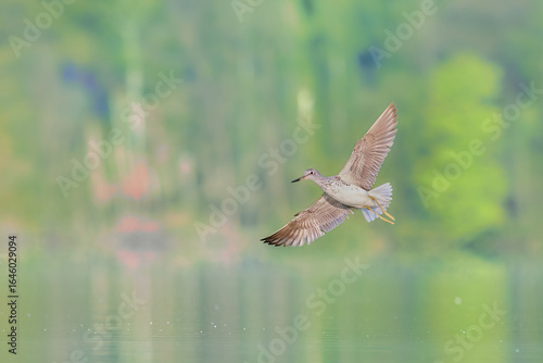 Obraz premium Greenshank while flying over the surface