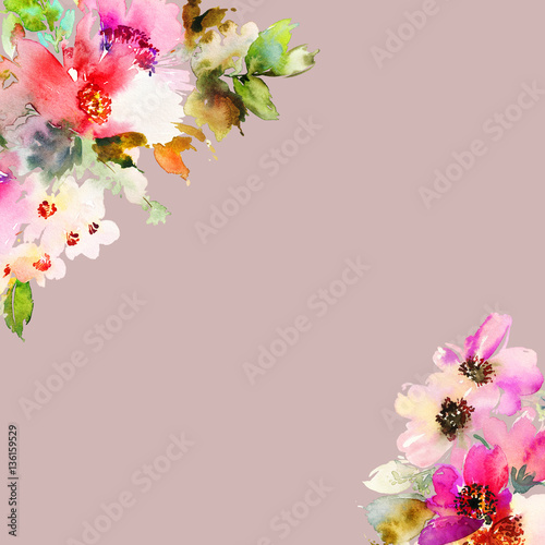 © Karma, Naklejka premium Greeting card with watercolor flowers handmade.