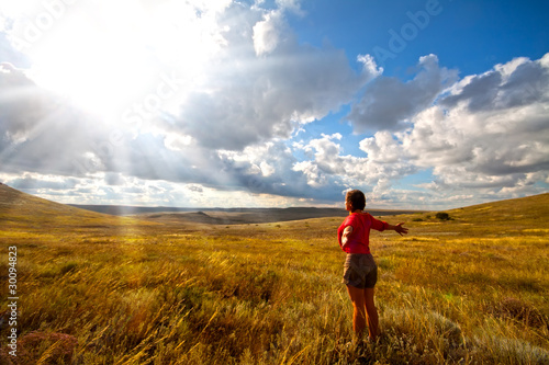 © Kotangens, Fototapeta premium Greeting the sun, women on meadow and cloudy sky