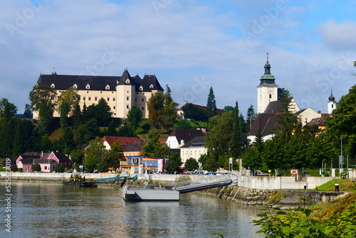 © cagala, Fototapeta premium Grein an der Donau mit Blick auf die Kirche und Schloss Greinburg