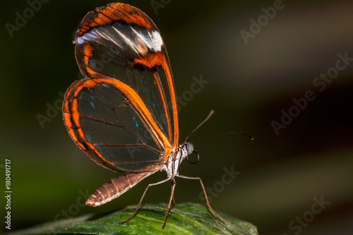 Naklejka premium Greta Oto, transparent winded butterfly lying on a green leaf