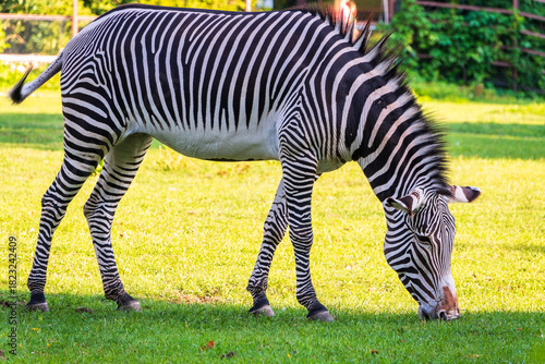 Naklejka premium Grevy's zebra, lat Equus grevyi, also known as the imperial zebra eats green grass.