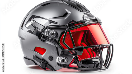 Fototapeta premium Grey American football helmet with red visor on white background.